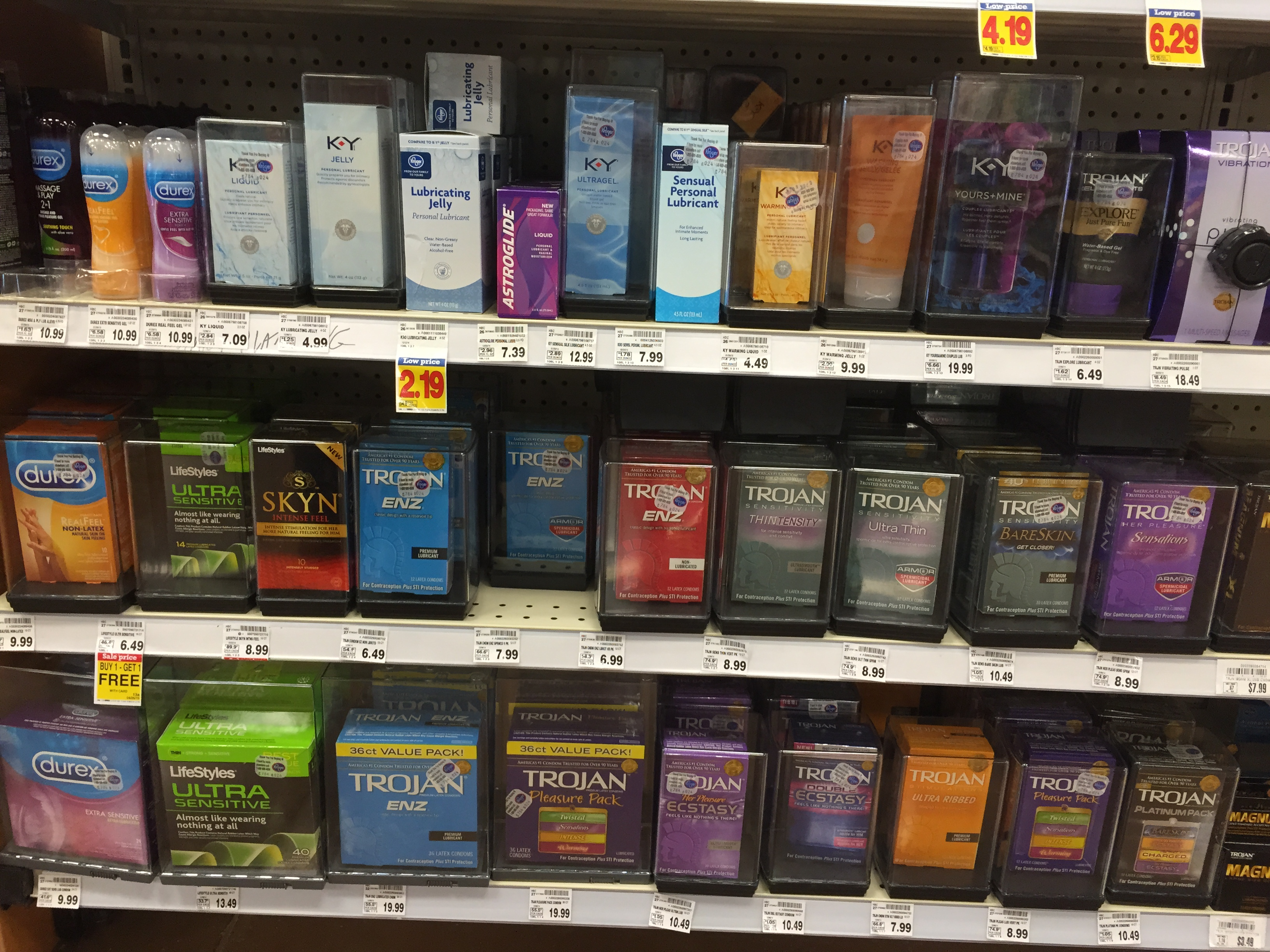 But at this Kroger’s the condoms are LOCKED UP like they’re ammunition or prescription drugs. Again, really? If I were running the store, I would not only leave these unlocked, I’d place them beside the door. Perhaps with a little sign: “Donations accepted but not required.” Really. Because by the time shoppers get home from hiking through this store, they’re gonna need a foot rub from their partners, and that can lead to, y’know, mashing the potatoes … ah! If only tubers were included on the index.