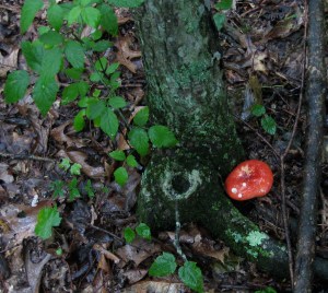 The woods are full of surprises. There’s a hollow tree stump containing a wad of tin foil and three golf balls. The work of a crow, I believe. There’s a very small area where rocket flowers grow, on the slope to the creek. I haven’t seen it anywhere else. Mayapples run riot in the spring; mushrooms of all types and sizes — from enormous puffballs to tiny, brilliant orange ones —  multiply in late summer and early fall. Moss expands and contracts along tree trunks depending on humidity and temperature.